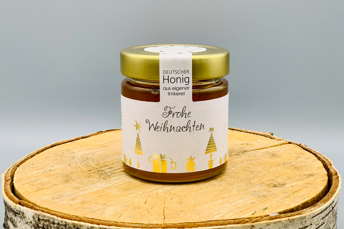 Dieses Honigglasetikett im weihnachtlichen Design verfügt über einen Gewährverschluss. Unsere hochwertige Konturstanzung ermöglicht dieses hohe Qualitätsversprechen für Ihren Honig vor Ihren Kunden. Durch die Goldveredelung verleiht das Etikett Ihrem Honigglas eine ganz besonders edle Optik. Dank des modernen weihnachtlichen Designs kann das Etikett für alle Honigsorten verwendet werden. Die Honigsorte können Sie ganz einfach im Bestellvorgang eintragen und sehen sofort die Vorschau Ihres individuellen Etiketts.