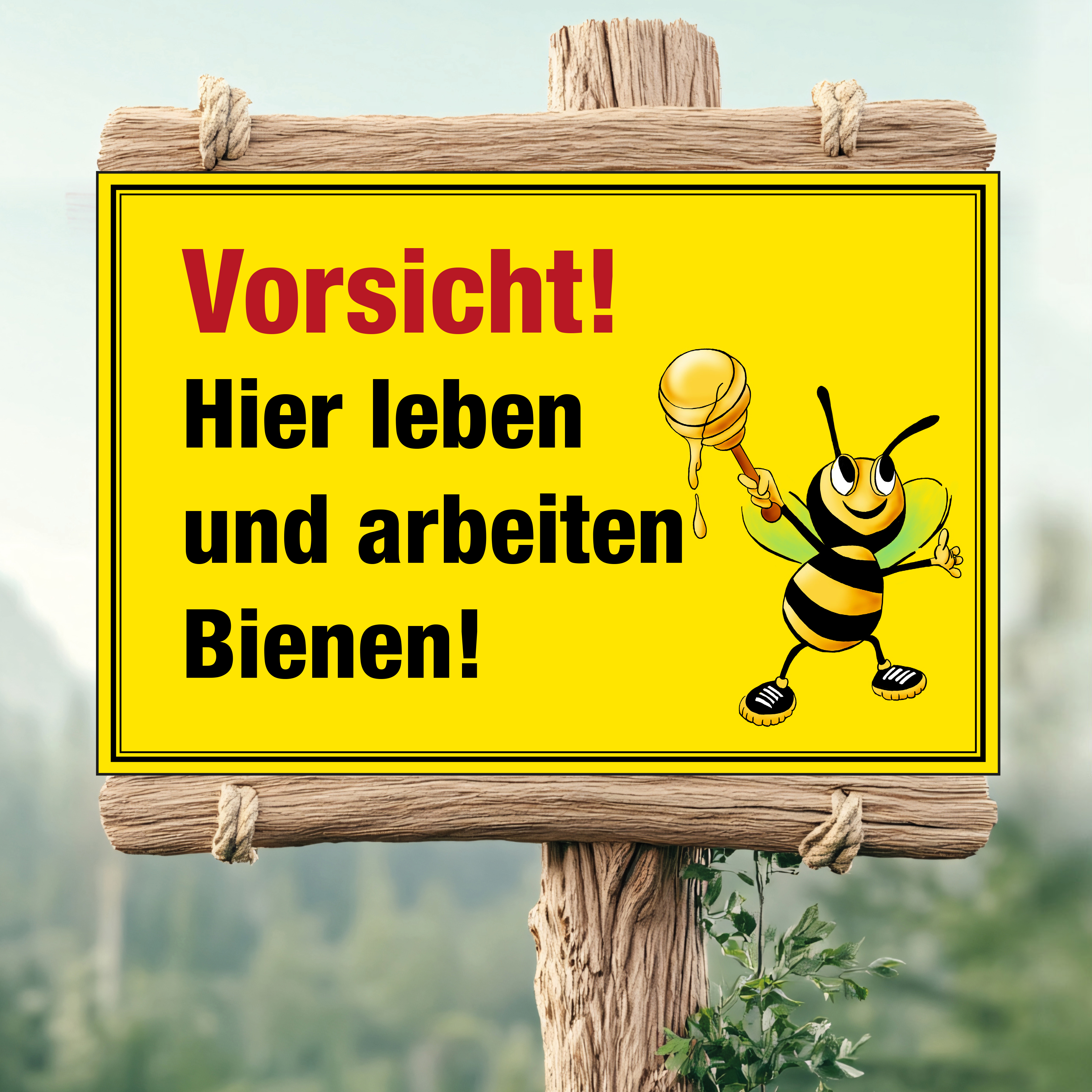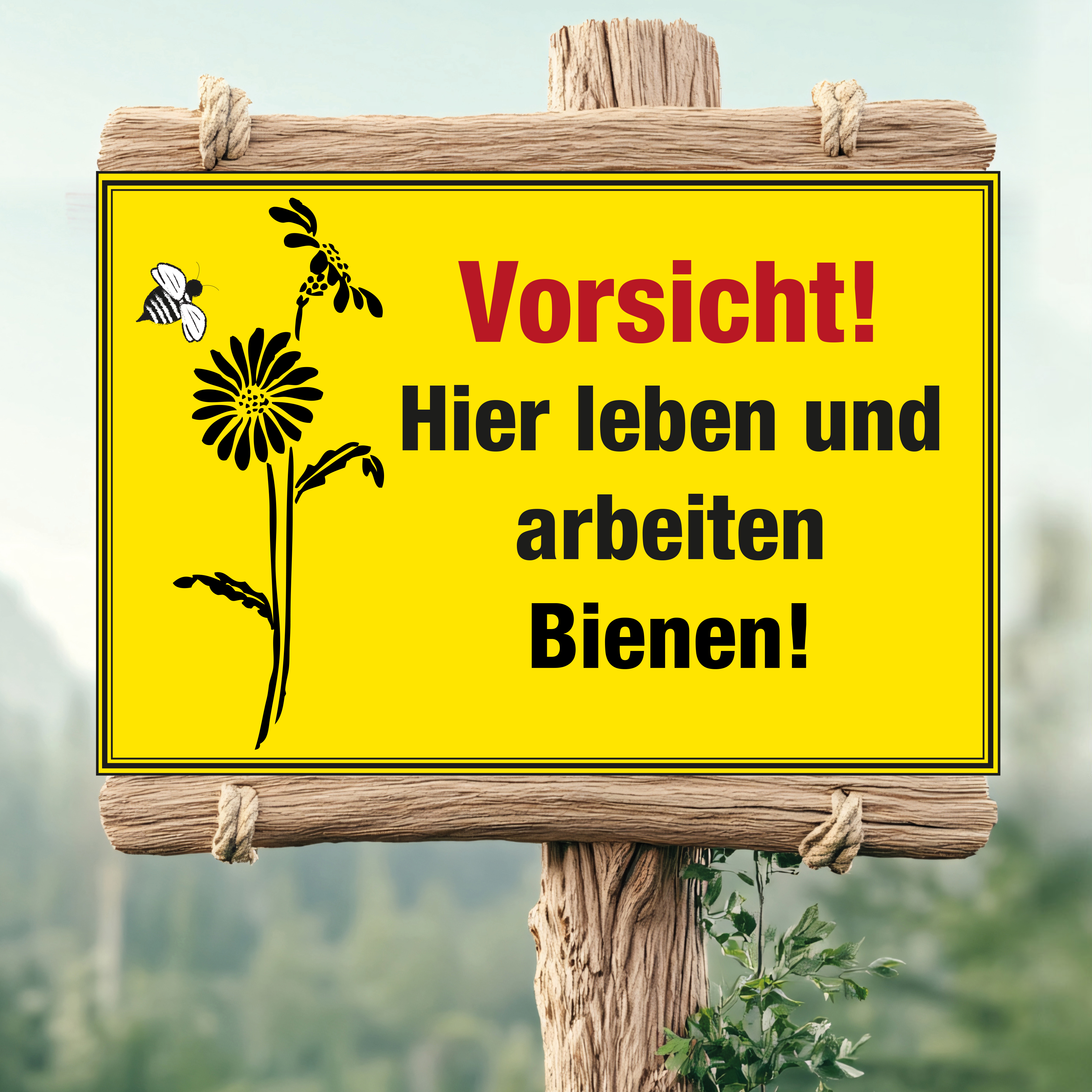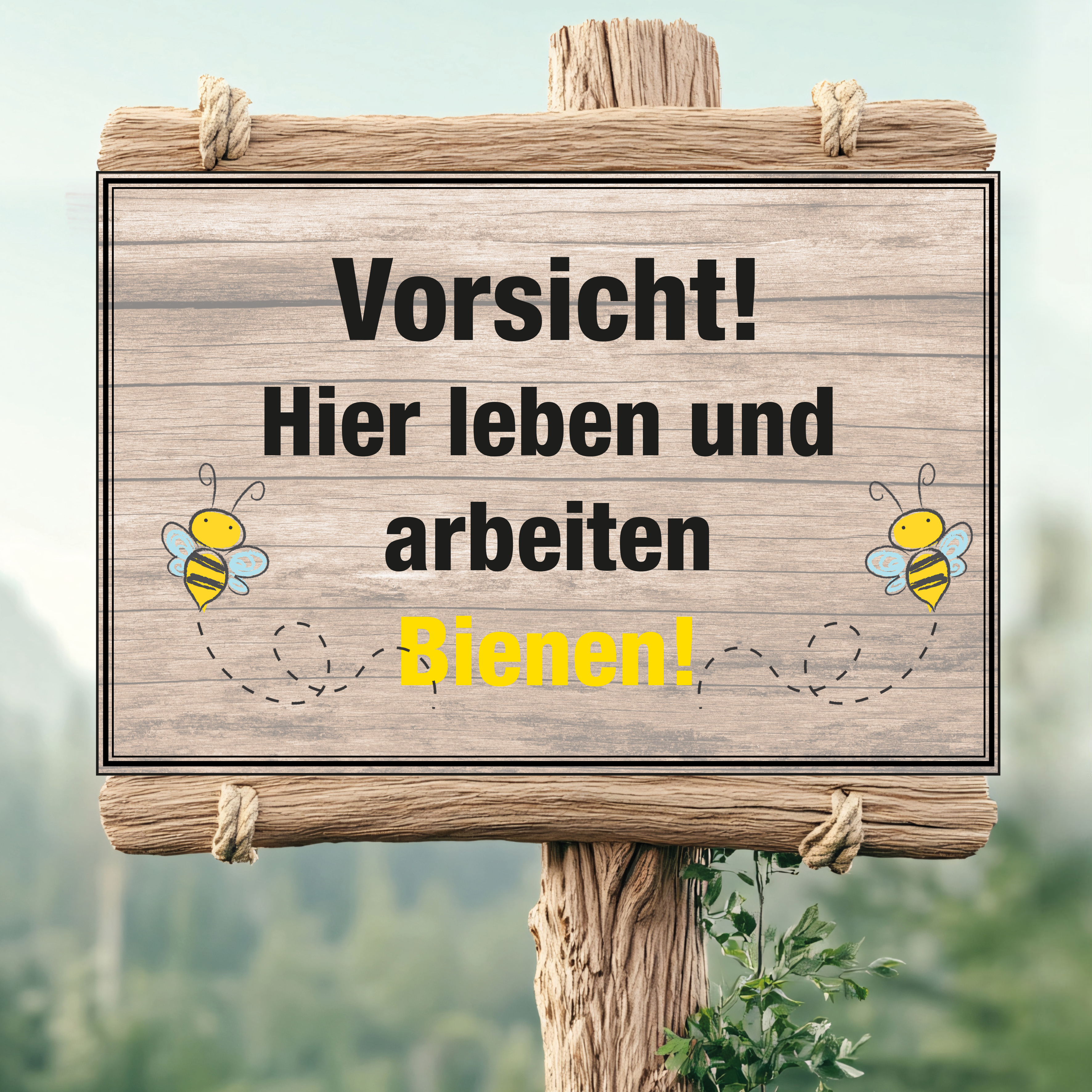 Schild "Vorsicht! Hier leben und arbeiten Bienen!" mit Biene
