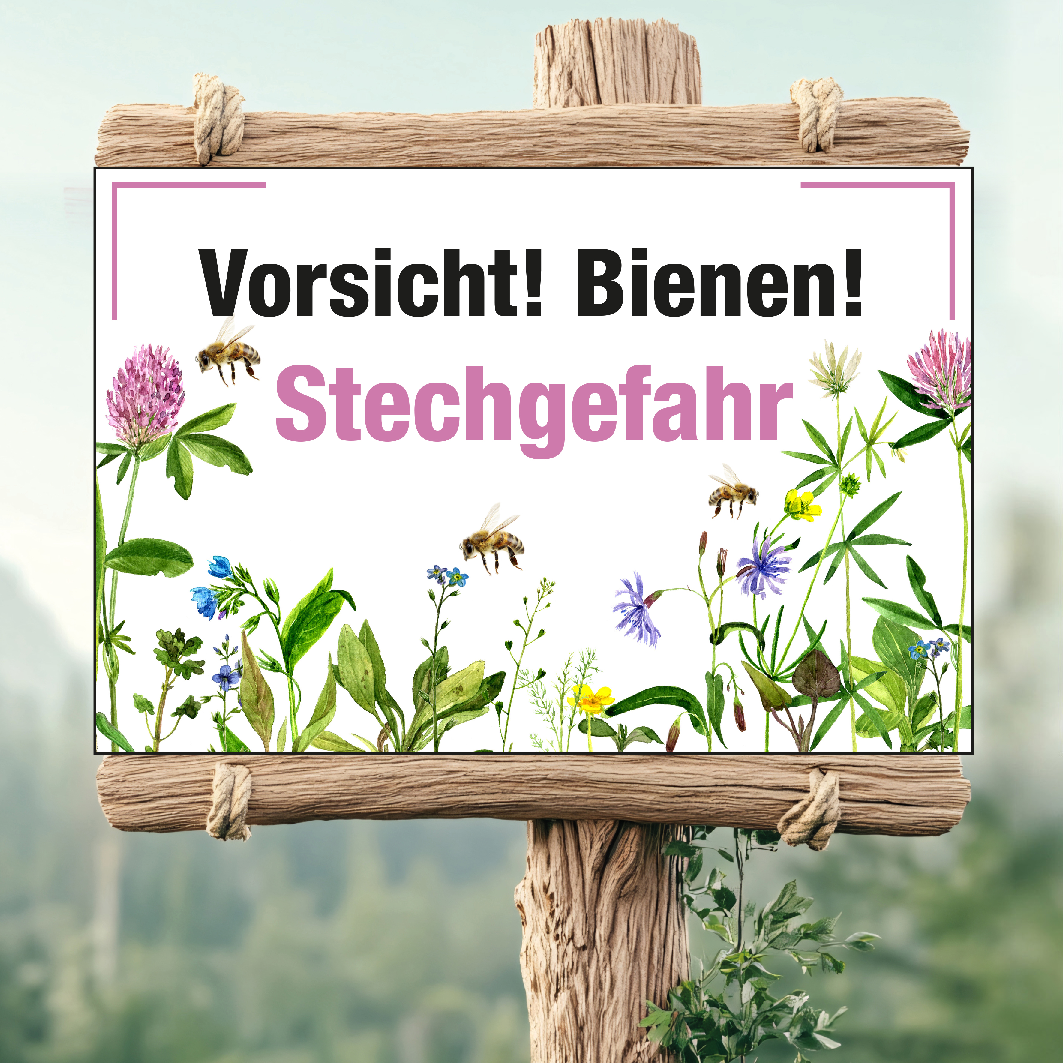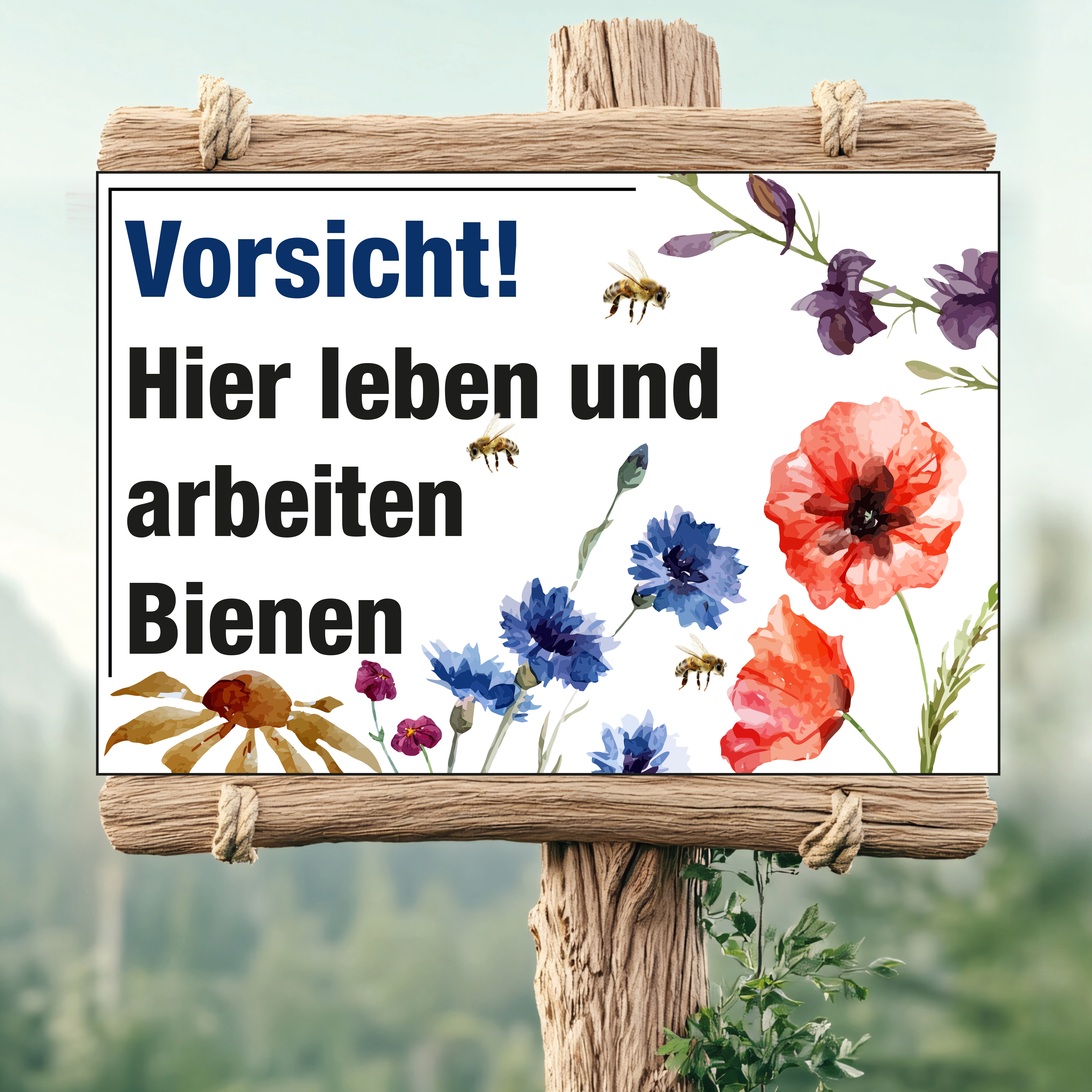 Schild "Vorsicht! Hier leben und arbeiten Bienen!" mit Blume